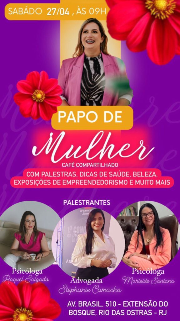 No próximo Sábado (27), Rio das Ostras recebe o evento Papo de mulher, o encontro será promovido pela advogada Noeme Themóteo, e contará com a participação de palestrantes, mulheres falando sobre a violência contra a mulher, autoestima e ressignificação. O Papo de Mulher será incrível, e contará com a presença das advogadas Dra Noeme Themóteo, […]